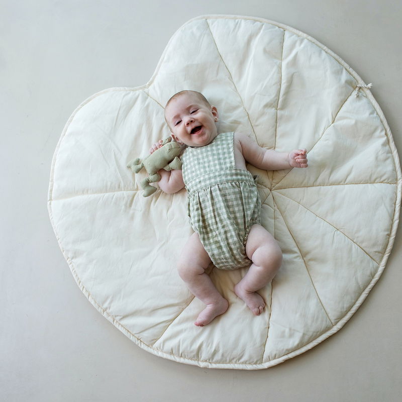 Eine weich gepolsterte Baby-Spielmatte in Form eines Seerosenblattes in den Farben Rosa, Olive oder Weiß. Die Spielmatte aus GOTS-zertifizierter Bio-Baumwolle fühlt sich weich an und wird mit einem separaten, handgefertigten Spielzeug in Form eines Frosches geliefert, das zum Knistern und Rasseln anregt. Die Spielmatte wird aufgerollt mit einem Bauchband aus natürlicher Baumwolle geliefert.
