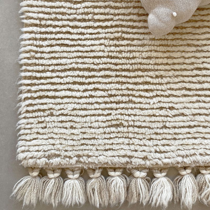 Der Koa Sandstone Teppich spielt mit zwei verschiedenen Wollschichten, wobei der Hintergrund in der Farbe Sandstone getuftet ist und oben von feinen Linien in ungefärbtem Schafsweiß durchzogen wird, wodurch ein subtiles Streifenmuster entsteht. Beide Farben werden an den Rändern mit sorgfältig handgeflochtenen Quasten vermischt.