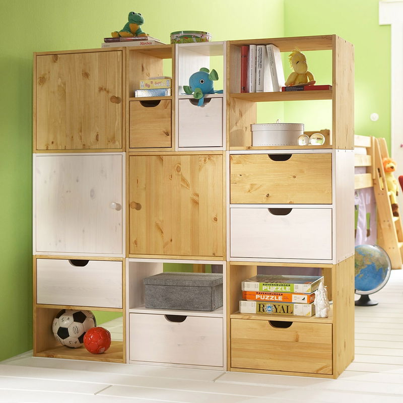 Das Würfelsystem von Infans Kids bietet Dir die Möglichkeit, Stauraum frei nach Deinen Bedürfnissen zu kombinieren. Die einzelnen Regalmodule kannst Du so stellen, wie Du möchtest, einzeln oder nebeneinander oder auch alles übereinander...Du kannst Sie auch an die Wand hängen. Der große und der kleine Würfel (nicht ihm mathematischen Sinne) sind dabei die Grundelemente. Beide lassen sich mit Schubkästen bestücken. Am großen Würfel kannst Du sogar eine Tür montieren. Diese wird mit Rückwand und Griff geliefert, es ist aber auch möglich von beiden Seiten eine Tür zu benutzen, wenn Du Dir einen Raumteiler aufbaust und beide Kinder Zugriff haben sollen. Die Module lassen sich immer wieder umstellen und neu kombinieren, Du kannst auch Teile zukaufen oder aus den drei Farben natur, weiß und gelaugt mixen.