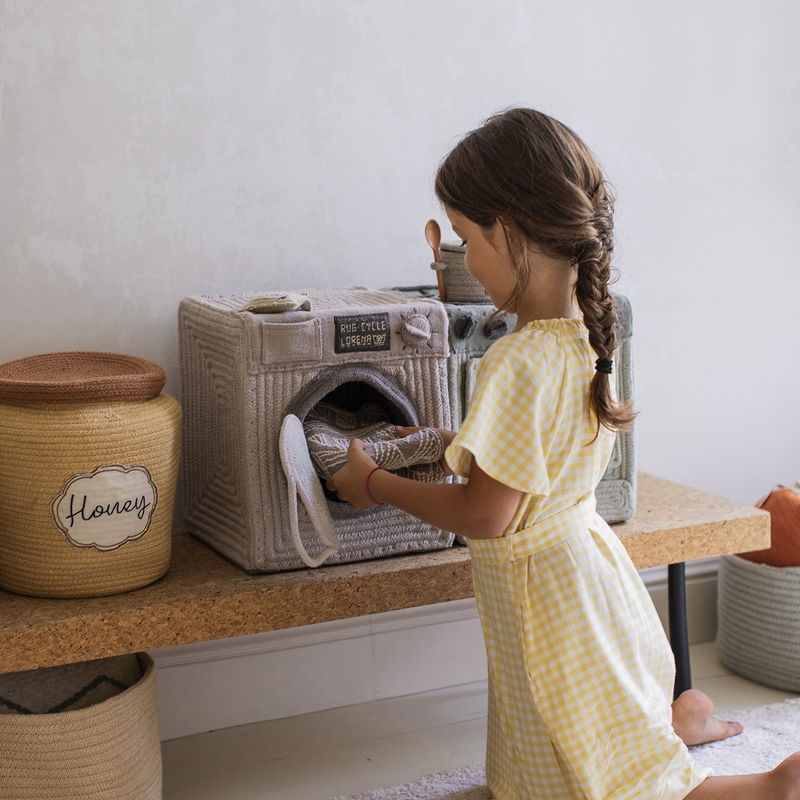Artikelnr.: p528569895Lieferzeit: , Lieferung am 21. - 24. November 2025Dimension Stellmaß: 30 x 33 x 31 cmEin Aufbewahrungskorb und ein Textilspielzeug in einem, in Form einer Waschmaschine mit Schwingtür, Drehschalter und Seifenspender. Das Set enthält einen Mini-Teppich von RugCycled® und eine kleine, gefüllte Waschmittelflasche aus Leinen für kreatives Spielen. Dieser Artikel wird mit viel Liebe zum Detail handgefertigt, so dass jedes Spielzeug ein Unikat ist. Es besteht aus geflochtenen Baumwollschnüren, die mit Fasern aus recycelten PET-Flaschen und Baumwollleinen gemischt sind, und kombiniert die Farben Perlengrau, Leinenfarben und Salbeiblau.