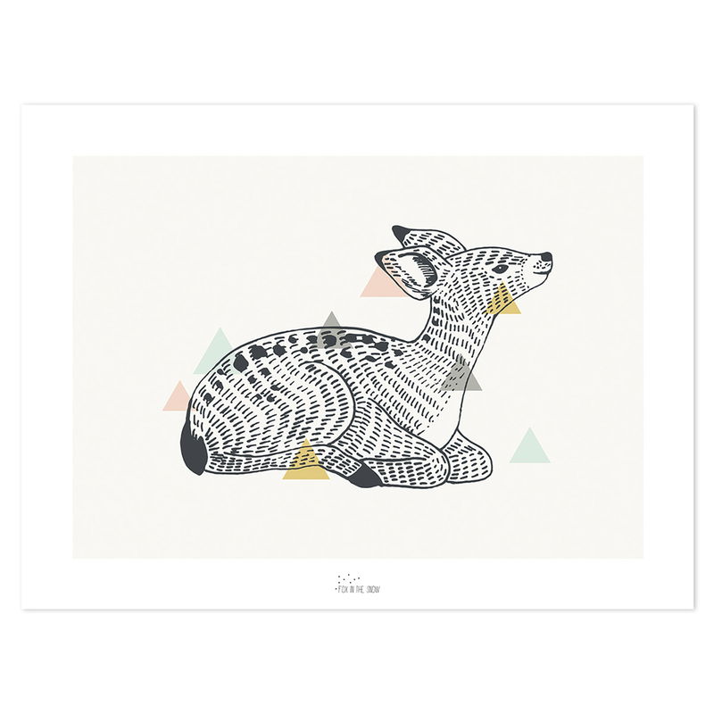 Wer sich für Rehkids und Waldthemen intressiert wird von dieser Serie entzückt sein. Der Style aus Tusche und bunten symmetrischen dreiecken geben dem Poster eine moderne Ausstrahlung. Passt Super zur Tapete Trinagles (in Jungs und Mädchen farbe erhältlich)