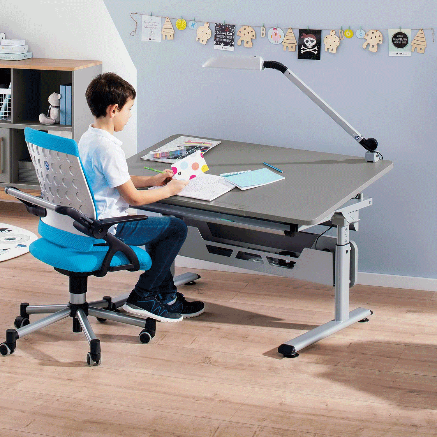 Sie haben nur ein kleines Kinderzimmer und möchten Ihrem Kind dennoch einen tollen Schreibtisch ermöglichen? Dann sollten Sie sich den Diego Schreibtisch von Paidi einmal genauer ansehen. Er hat die gleichen Funktionen wie seine größeren Brüder, passt jedoch viel besser in kleine Ecken. Mit einer Breite von nur 120 cm hat Ihr Kind trotzdem ausreichend Platz auf der Tischplatte und kann ergonomisch korrekt daran sitzen. Die Tischplatte wurde absichtlich in Schiefergrau und nicht in einem reinem Weiß entworfen, damit Ihr Kind beim Arbeiten (vor allem wenn eine Schreibtischlampe angeschaltet wurde) nicht geblendet wird .