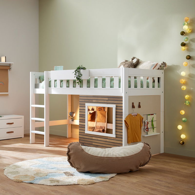 Artikelnr.: p1717271Lieferzeit: , Lieferung am 15. - 16. Dezember 2025Dimension Stellmaß: H 128 / B 207 / T 105 cmDas halbhohe Hüttenbett der Limited Edition 2023-10 von Lifetime verkörpert höchste Qualität und zeitloses skandinavisches Design. Gefertigt aus massiver Kiefer und MDF, besticht es nicht nur durch seine Stabilität, sondern auch durch seine ansprechende Optik in deckendem Weiß. Die mitgelieferten Deko-Paneele verleihen dem Bett eine zusätzliche Dimension, indem sie es in eine abenteuerliche Spielhöhle verwandeln. Mit seitlichen Paneelen, ausgestattet mit Stauraum, Gummilaschen und Lederhaken, bietet es zudem praktischen Nutzen für die Aufbewahrung von Kleidung und Accessoires. Die robuste Leiter, flexibel positionierbar, gewährleistet eine sichere Nutzung für Kinder jeden Alters. Das mitgelieferte Rollrost ist belastbar bis zu 150 kg und macht das Bett vielseitig nutzbar. Als Basisbett ist es kompatibel mit verschiedenen An- und Umbauteilen der Lifetime Original Serie, was eine individuelle Anpassung ermöglicht. Es sei jedoch darauf hingewiesen, dass die Deko-Paneele unverzichtbar sind, um das volle Potenzial des Bettes auszuschöpfen. Als Limited Edition verkörpert es Exklusivität und steht für höchste Ansprüche an Qualität und Langlebigkeit. Durch sein einzigartiges Design und seine funktionalen Eigenschaften wird es zum bevorzugten Schlafplatz für jedes Kind oder jeden Jugendlichen, unerreicht von anderen Betten seiner Art. -