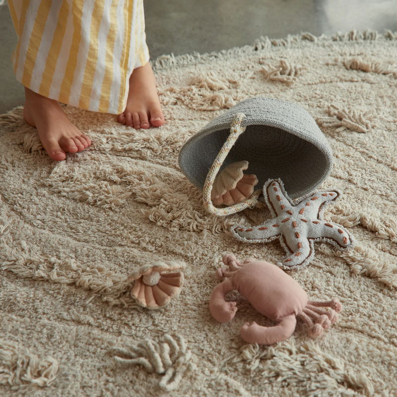 Artikelnr.: p5285695477Lieferzeit: , Lieferung am Auf BestellungDimension Stellmaß: Ø 122 cmIndem es unterschiediche Florhöhen und Formen kombiniert, erweckt es das Bild von Sanddünen an einem schönen Strand. Umringt von kurzen Fransen in Natur und Salbeiblau, die die Meeresküste repräsentieren, kommt diese flauschige Teppich mit einem Set Stoffspielzeugen: einem geflochtenem Spieleimer in Salbeiblau, einer weichen Krabbe, ein handgeflochtenen Seestern und zwei Muscheln mit kleinen Perlen.