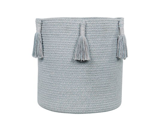 Der Korb ist mit einer zweifarbigen geflochtenen Kordel aus Baumwoll-Melange (himmelblau und perlgrau) veredelt, um einen wechselnden Effekt zu erzielen, wie bei den Farbtönen der Natur. Der Korb ist in der idealen Größe erhältlich, um alle möglichen Objekte zu lagern und zu organisieren, und ist mit dekorativen, handgemachten Quasten am Rand verziert.Alle Baumwollkörbe von Lorena sind ausschließlich mit unbedenklichen Naturfarben gefärbt und unterliegen strengsten Qualitäts- und Umweltkontrollen und können sich in den Farbtönen leicht unterscheiden.