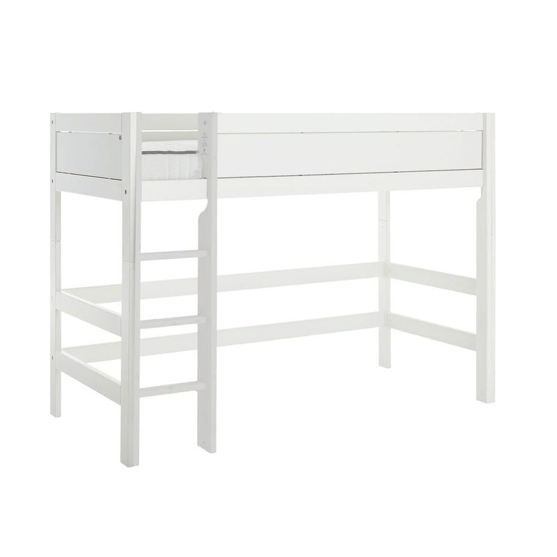 Mittelhohes Spielbett in deckend weiß, mit Rollrost und gerader Leiter