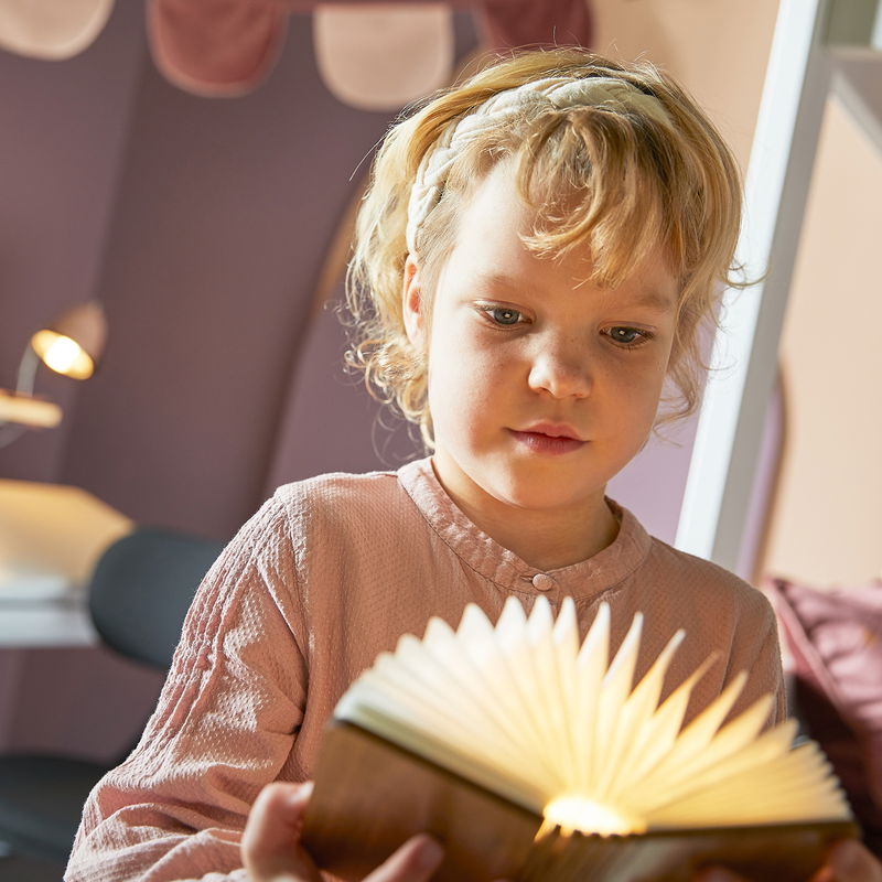 Diese clevere Buchlampe schaltet sich ein, wenn das "Buch" geöffnet wird. Wunderschönes weiches Licht scheint durch die leuchtenden Buchseiten und verwandelt dein Zimmer in ein magisches Universum. Die Leuchte ist über USB wiederaufladbar, inklusive USB-Ladekabel.
