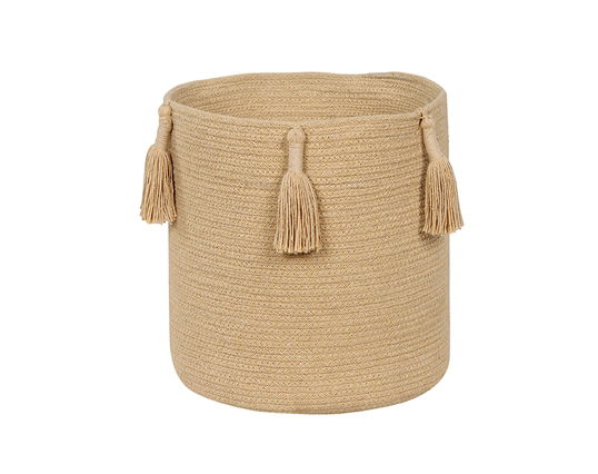 Der Korb ist mit einer zweifarbigen geflochtenen Kordel aus Baumwoll-Melange (heller und dunkler Honig Ton) veredelt, um einen wechselnden Effekt zu erzielen, wie bei den Farbtönen der Natur. Der Korb ist in der idealen Größe erhältlich, um alle möglichen Objekte zu lagern und zu organisieren, und ist mit dekorativen, handgemachten Quasten am Rand verziert.Alle Baumwollkörbe von Lorena sind ausschließlich mit unbedenklichen Naturfarben gefärbt und unterliegen strengsten Qualitäts- und Umweltkontrollen und können sich in den Farbtönen leicht unterscheiden.