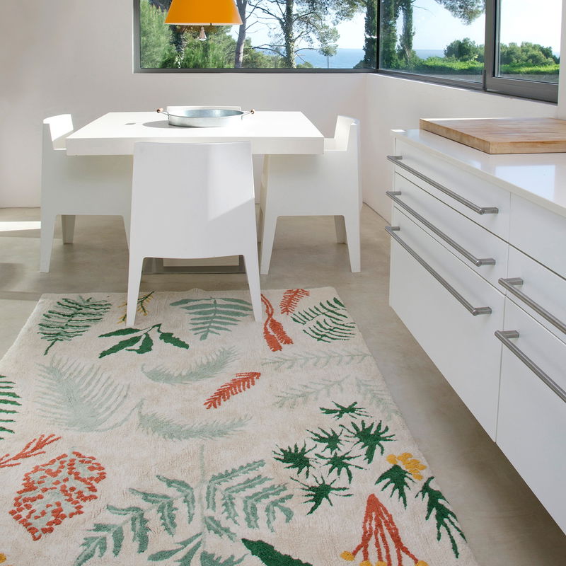 Mit dem ausgefallenen Botanic Design im floralen Stil hat Lorena Canals einen farbenfrohen Teppich entworfen. Diese Farbkombination zeigt Fröhlichkeit mit botanischem Akzent. Den flauschige Baumwollteppich ziert jedes Zimmer und lädt zum Verweilen ein. Wird hier mal ein Getränk verschüttet oder mit Schokoladenfingern angefasst, ist das gar nicht so schlimm. Dieser Teppich lässt sich einfach in die Waschmaschine stecken und bei maximal 30°C waschen.