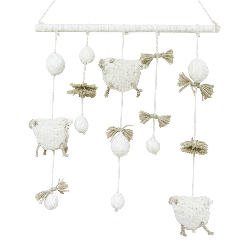 Dekorativer Wandbehang mit fünf Girlanden aus handgefertigten kleinen Schafen, Mini-Quasten und Wollkugeln, die an einem mit Wollgarn umwickelten Rohr befestigt sind und mit einer gemischten Woll- und Baumwollkordel zum Aufhängen an der Wand. Wird mit einem Beutel aus Baumwollschnur geliefert.