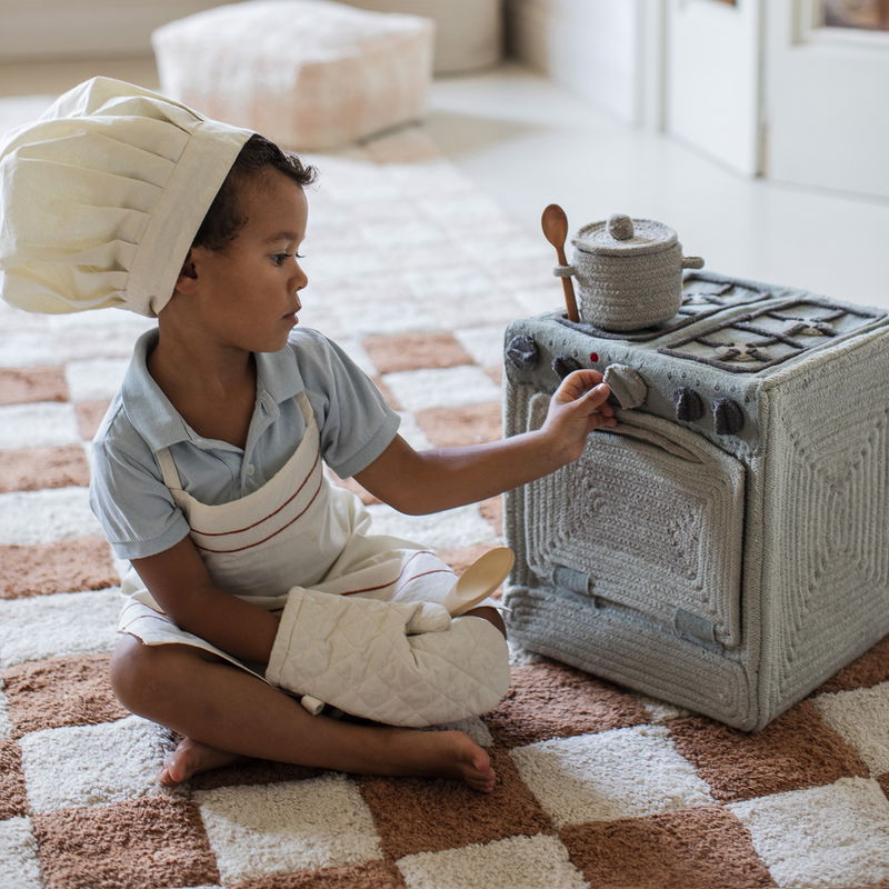 Artikelnr.: p528569891Lieferzeit: , Lieferung am 19. - 20. November 2025Dimension Stellmaß: 30 x 33 x 26 cmEin vollständig handgefertigter textiler Spielzeugherd, der gleichzeitig ein Aufbewahrungskorb ist. Er wird mit handwerklichen Korbflechttechniken hergestellt, wobei geflochtene Baumwollschnüre mit Fasern aus recycelten PET-Flaschen und Baumwollleinen in der dominierenden Farbe Blue Sage gemischt werden. Diese Spielküche ist viel mehr als nur ein Korb, denn sie wird mit einem textilen Spielzeugkochtopf aus RugCycled®-Kordeln und einem gepolsterten Baumwoll-Ofenhandschuh in Kindergröße geliefert. Auf der Vorderseite befinden sich eine rechteckige Backofentür und ein Bedienfeld aus Baumwollstoff mit fünf Drehknöpfen. Das Kochfeld ist mit gestickten Kabeln versehen, die einen traditionellen Gasherd simulieren. Der Herd ist in einem staubigen Farbton von Salbeiblau gehalten, mit Details in Perlen- und Dunkelgrau, und wird einzeln in einer Pappschachtel verpackt. Die handgefertigten Details machen jede Spielküche zu einem Unikat und zu einem unverzichtbaren Spielzeug, das die Fantasie der Kinder im Sinne der Montessori-Philosophie anregt.