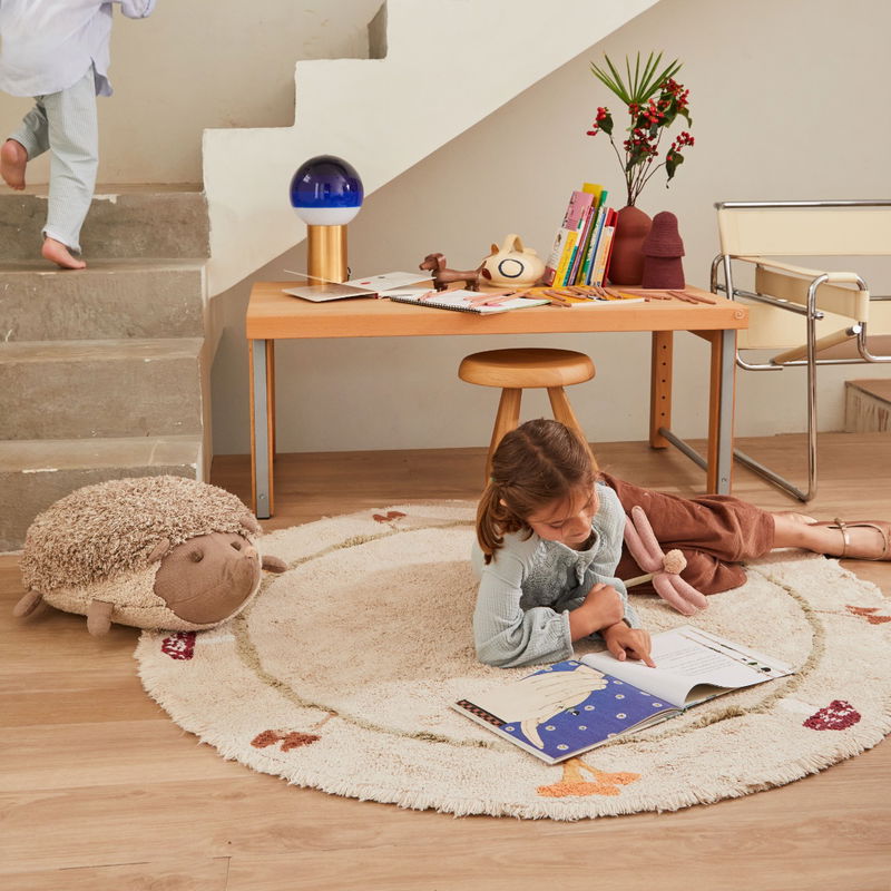 Die warmen Farben in Honig, Burgunderrot, Toffee und Elfenbein vereinen sich mit einer Bordüre aus fantasievollen Pilzen, die in unterschiedlichen Texturen und Mustern erstrahlen. Das weiche Tufting und die charmanten Canvas-Flecken schaffen eine besonders gemütliche Oberfläche zum Spielen, Entspannen und Träumen. Ideal für kleine Träumer und Abenteurer, die eine gemütliche und einladene Atmosphäre suchen. -