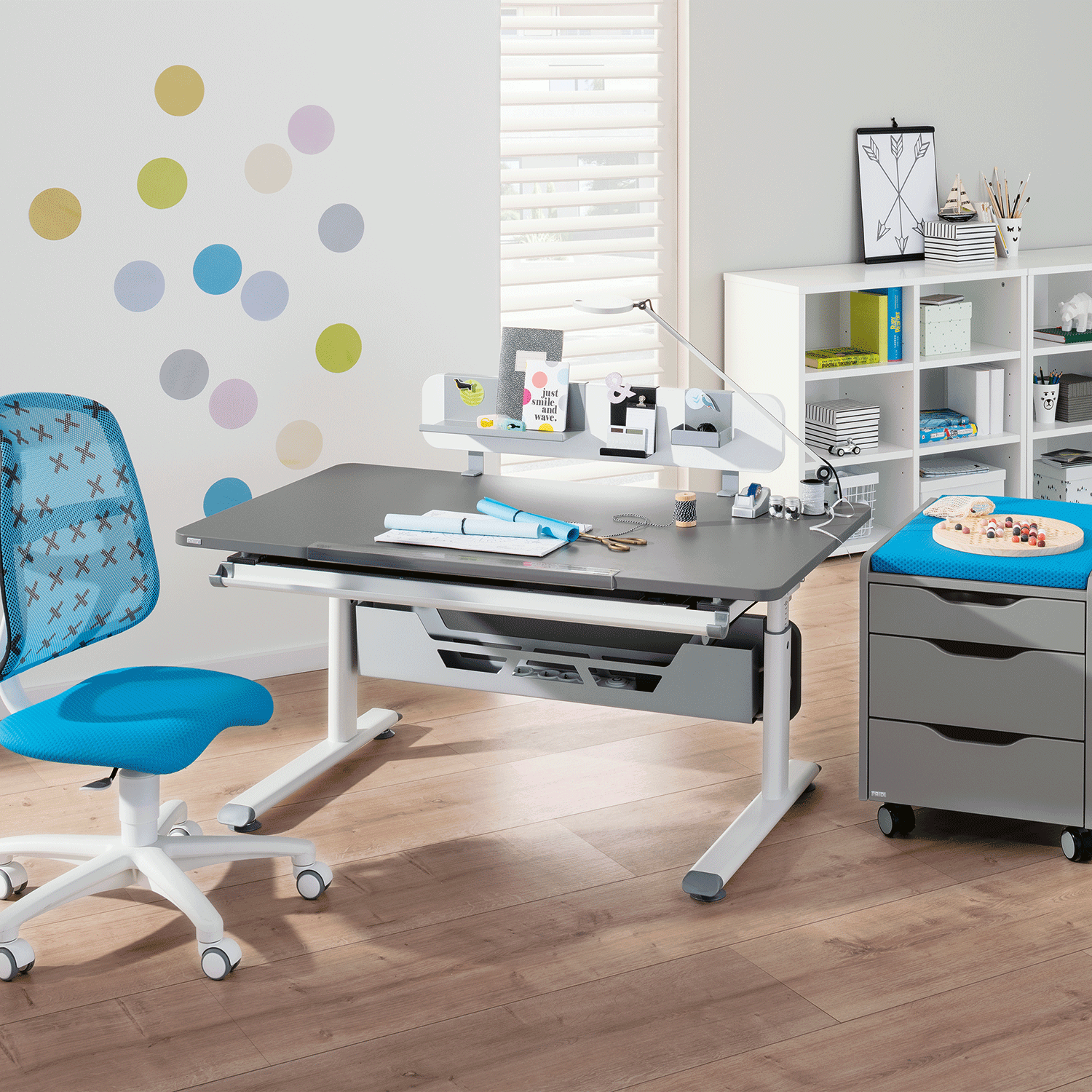 Sie haben nur ein kleines Kinderzimmer und möchten Ihrem Kind dennoch einen tollen Schreibtisch ermöglichen? Dann sollten Sie sich den Diego Schreibtisch von Paidi einmal genauer ansehen. Er hat die gleichen Funktionen wie seine größeren Brüder, passt jedoch viel besser in kleine Ecken. Mit einer Breite von nur 120 cm hat Ihr Kind trotzdem ausreichend Platz auf der Tischplatte und kann ergonomisch korrekt daran sitzen. Die Tischplatte wurde absichtlich in Schiefergrau und nicht in einem reinem Weiß entworfen, damit Ihr Kind beim Arbeiten (vor allem wenn eine Schreibtischlampe angeschaltet wurde) nicht geblendet wird .