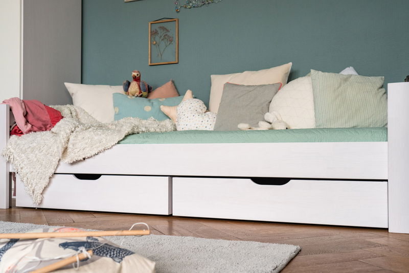 Die destyle Basisliege ist eine moderne Jugendliege aus Buche Massivholz, die von Wookids in höchster Qualität gefertigt wird. Diese Liege hat eine dreiseitige Umrahmung und kann somit prima am Tage als Sofa genutzt werden. Der mitgelieferte Rollrost sollte fest mit dem Bett verschraubt werden. Der Rollrost ist sehr stabil, da die Leisten sehr dick sind. Somit können die Kinder auch ohne Probleme auf dem Bett herumspringen, ohne das auch nur eine Leiste bricht. Falls gewünscht, kannst Du das Bett mit Umbausätzen (Zukauf) auch zu einem Spiel-, Hoch- oder Etagenbett umbauen.