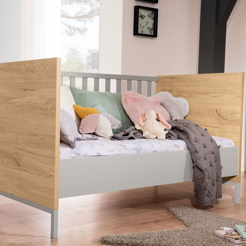 Das Paidi Benne Kinderbett kombiniert helles Kieselgrau mit warmer Eiche-Montana-Nachbildung und lädt zu einem gemütlichen Nickerchen ein. Der 4-fach verstellbare Lattenrost schont in den ersten Wochen und Monaten Deinen Rücken und wandert mit der Entwicklung Deines Kindes weiter nach unten. Wenn Dein Kind selbstständig stehen kann, schützt es in der tiefsten Einstellung vor dem Herausklettern. Dank der zwei Schlupfsprossen in der Gitterseite kann Dein Kind später selbst hinaus- und hineinklettern. Will Dein Kind irgendwann nicht mehr im Gitterbett BENNE schlafen, hast Du die Möglichkeit, die Gitterseiten durch optional erhältliche Umbauseiten zu ersetzen. Im Handumdrehen entsteht dadurch ein schönes Juniorbett, welches bis zu einer Körpergröße von 120 cm nutzbar ist. Statt der einzelnen Umbauseiten bietet Paidi auch ein Sicherheits-Set an. Damit kannst Du das Babybett Benne zu einem Juniorbett mit Wandschutzseite und kleiner vorderen Absturzsicherung umbauen. So schläft Dein Kind fast wie ein Großer. Auf diese Kombination kann man dann zusätzlich noch ein passendes Spielzelt montieren. Achtung: das Spielzelt kann nur auf das Sicherheitsset montiert werden.